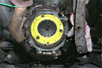 As soon as it was together we fired it up to see how it sounded, and it did fire right up (no battery connection problems like a couple of days ago) but there was still a problem. It made one of the same noises that it made from before we brought it in. The metal rattle scraping sound was gone from the throw out bearing. BUT, there was still a rattling sound coming from the same area as before. We drove it around the block & it was definitely still one of the sounds it was making from before. So, we put it back up on the lift to see if we could tell where it was coming from. We listened and it sounded like it was coming from the back bearing in the tranny.